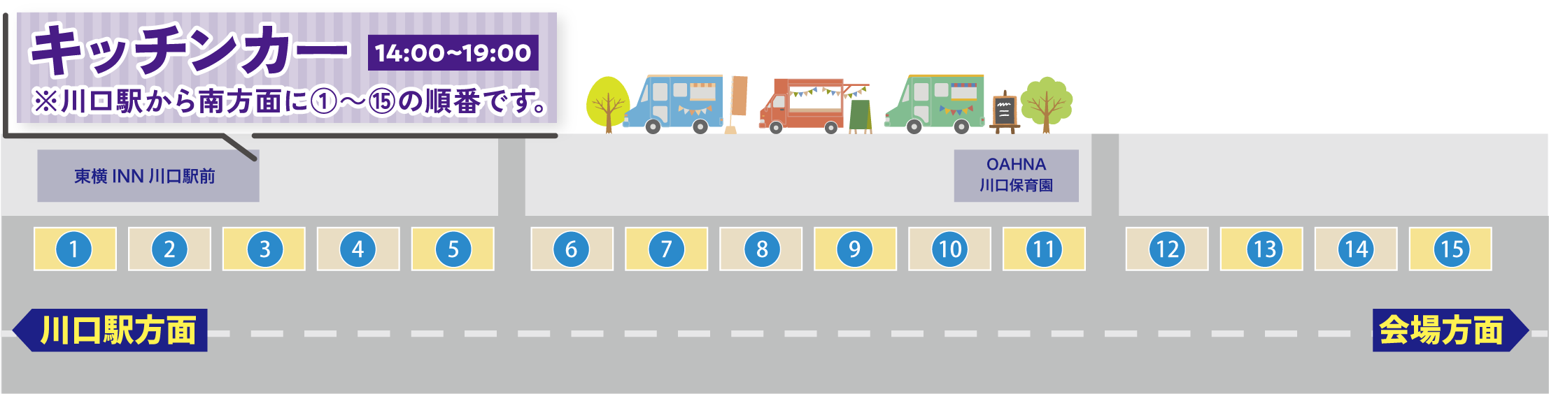 焼きそば・かき氷・冷凍みかん・チョコバナナ・からあげ・チュロス・串焼き・ドリンク